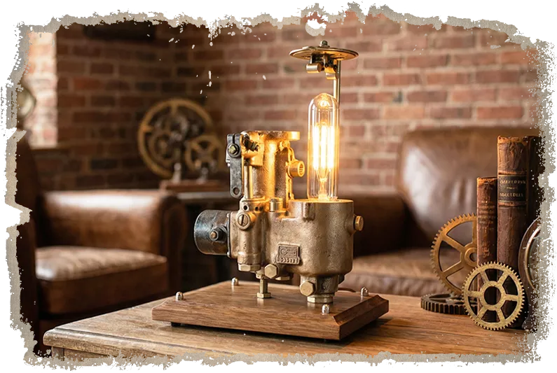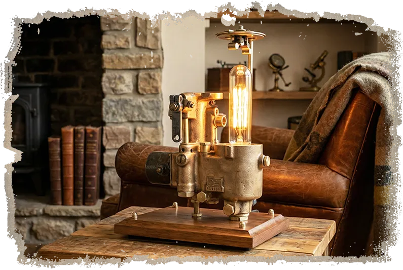 The restoration was intentionally focused on revealing the brass rather than over-designing the lamp. After soaking and cleaning the carburettor, the real character began to emerge, so I kept the final build clean and disciplined. The internal float was removed to make room for the globe holder, while the original float cover was repurposed into a branded lampshade, turning a key component of the carburettor into one of the lamp's strongest visual features. A polished brass tube, threaded rod, and dome nut completed the upper structure with a finish that feels refined, confident, and mechanically honest.