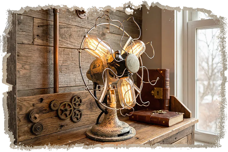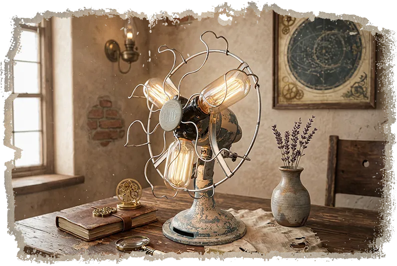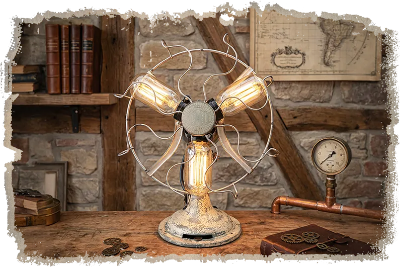 Restored from a rare pre-war Limit fan and reimagined as a glowing sculptural "Flamp," this statement piece turns fragile age, ornate engineering and soft industrial light into one unforgettable object.