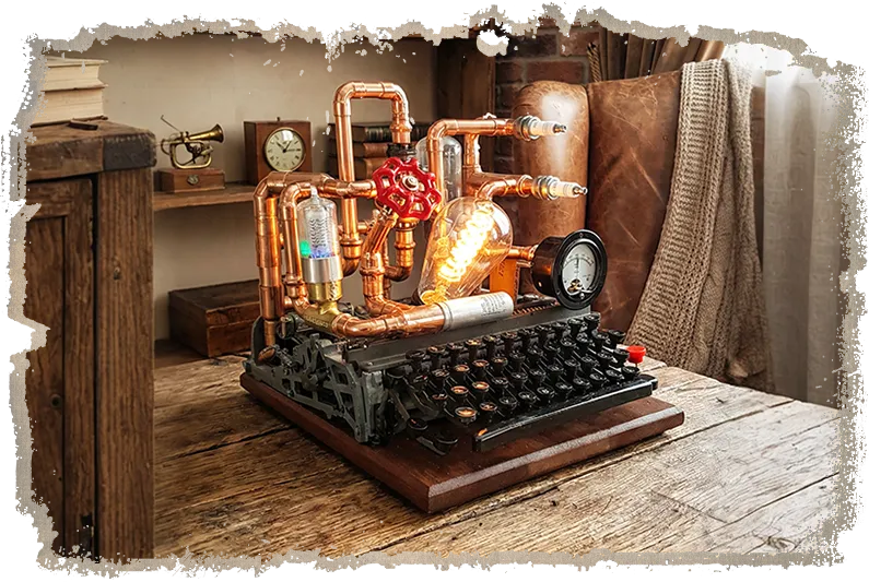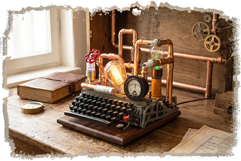 A 1950 Olivetti Lettera 22 typewriter forms the foundation of this one-of-a-kind desk lamp, reimagined with copper pipework, vacuum valves, vintage electronic components and warm filament light to create a piece shaped by both writing history and scientific imagination.